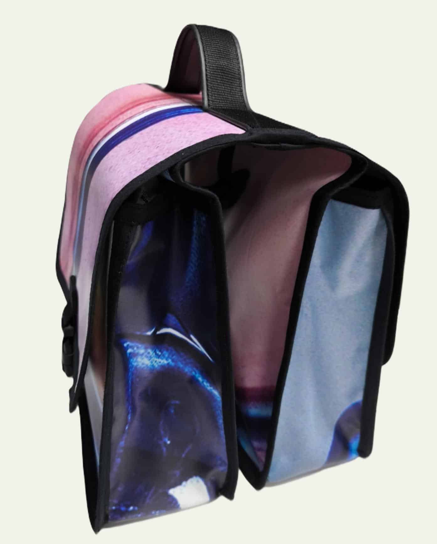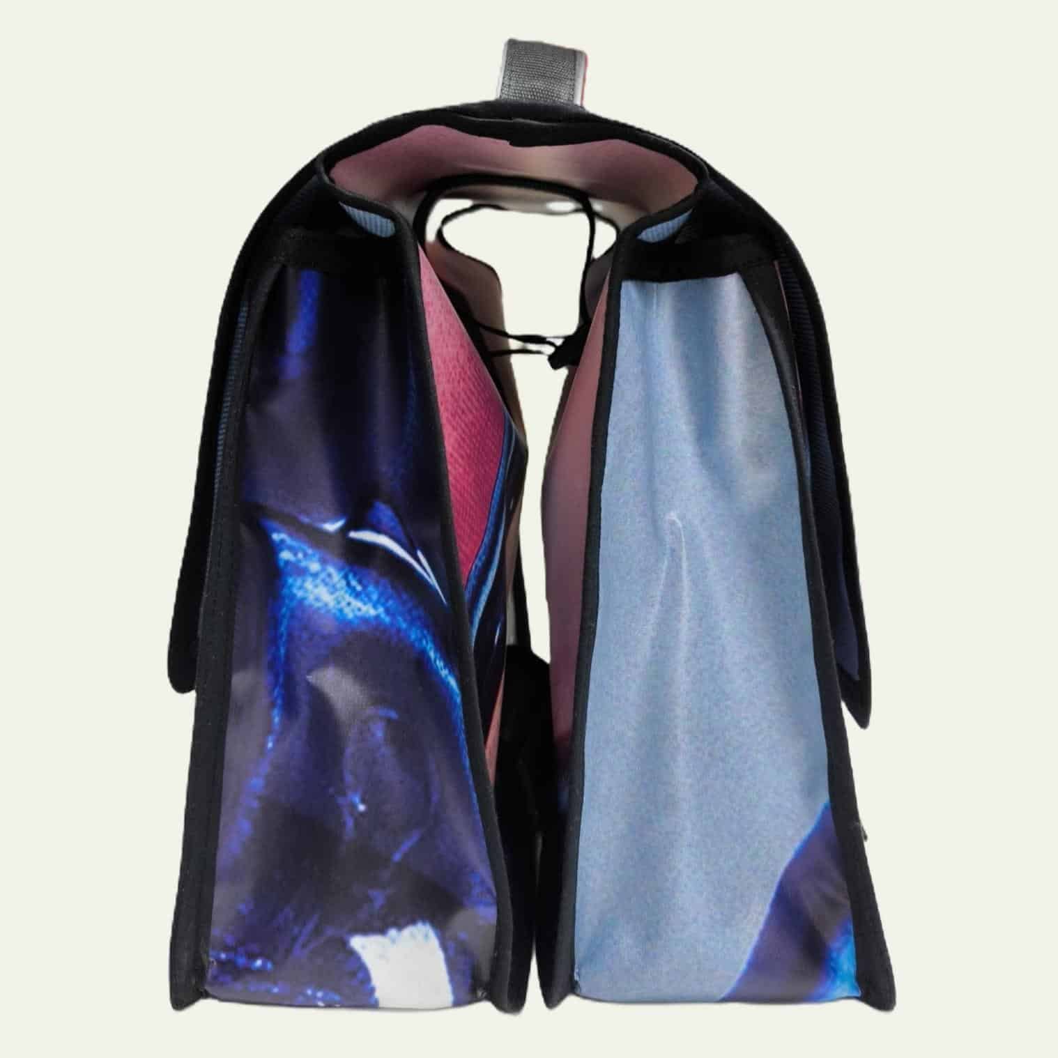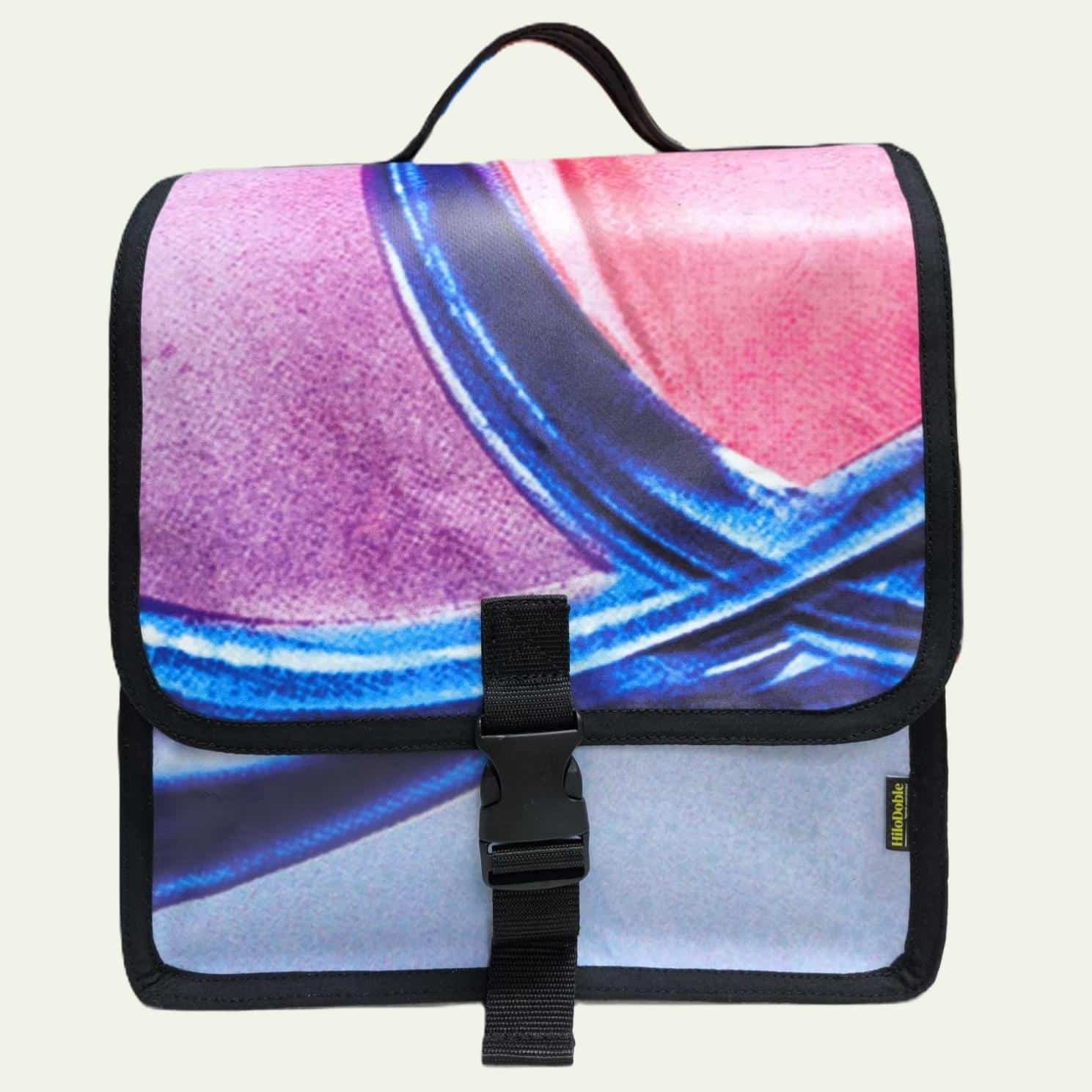 Alforja doble de lonas recicladas para bicicleta de formato universal. Realizada con banderolas publicitarias recicladas. Tres puntos de sujeción con velcro en ambos lados y asas para llevarlo en la mano cómodamente.