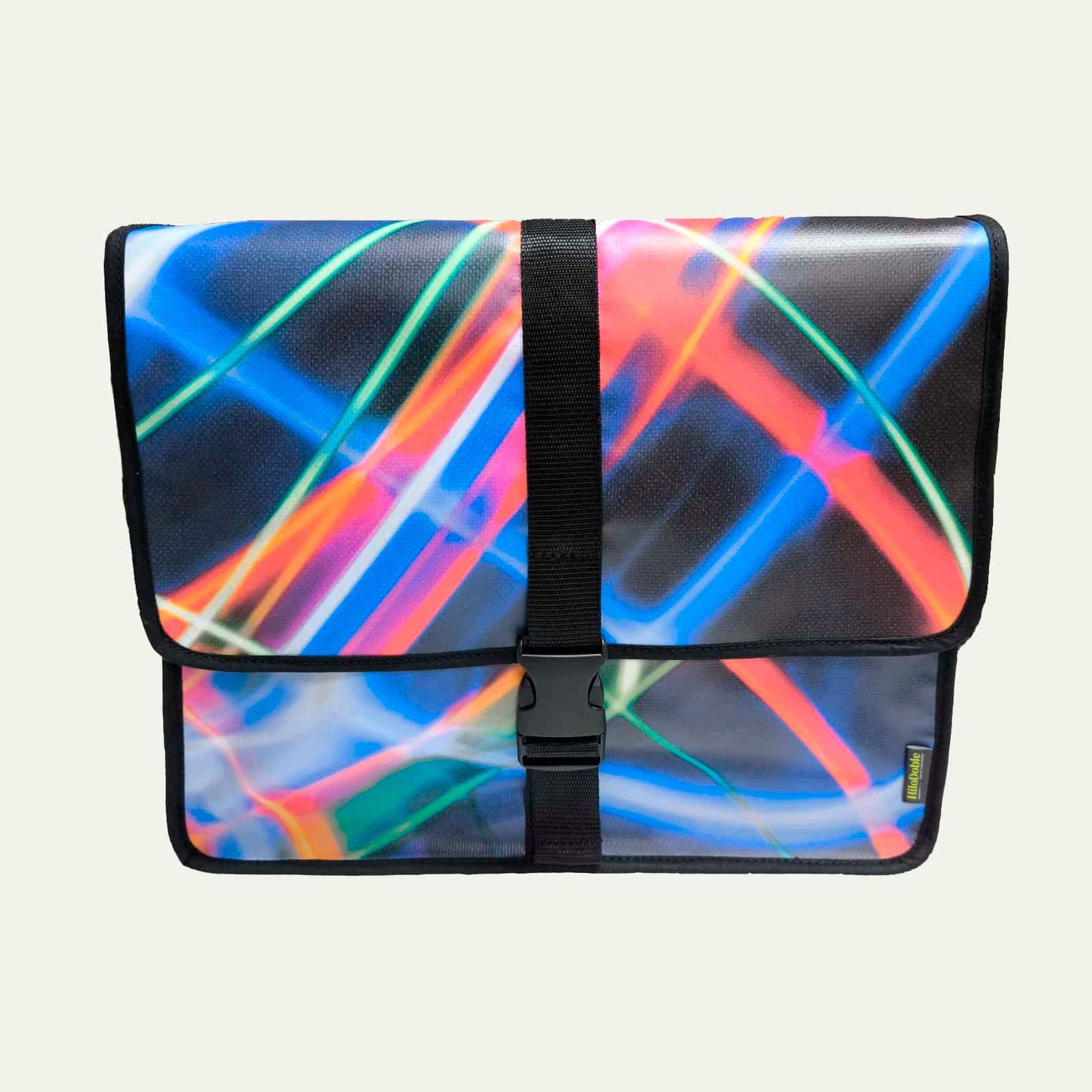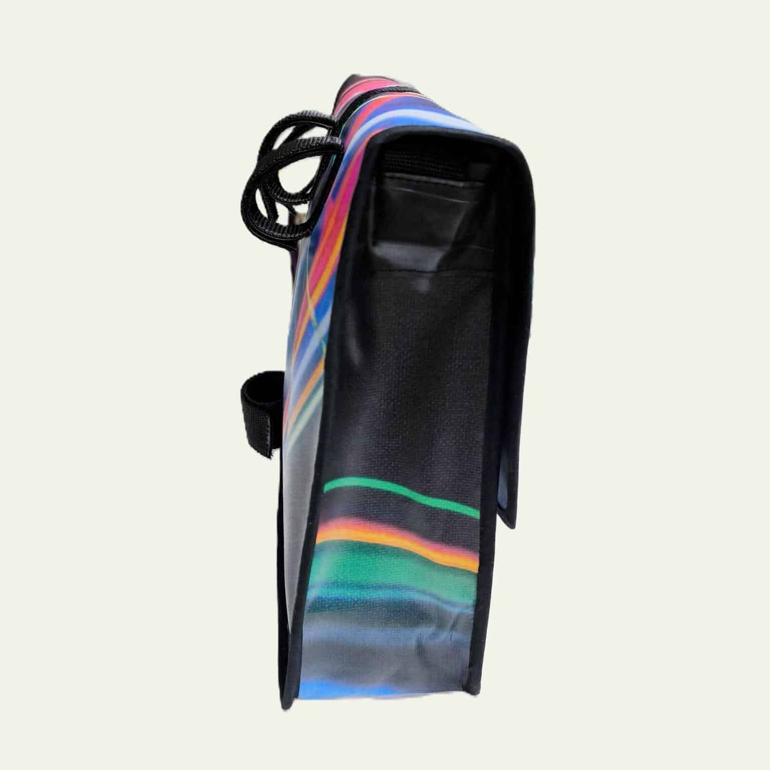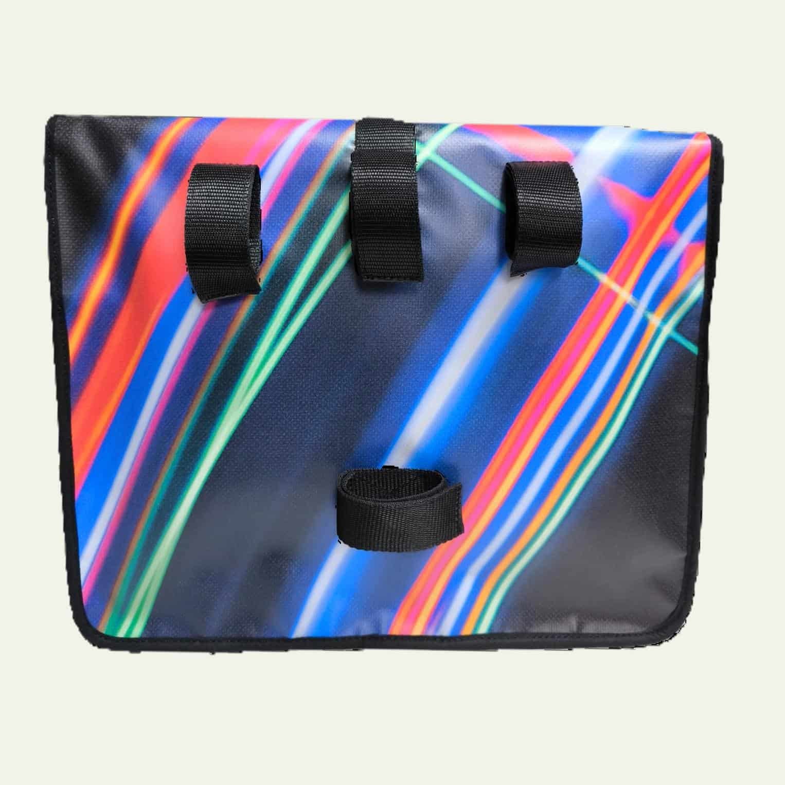 Alforja simple de lonas recicladas para bicicleta de formato universal. Realizada con banderolas publicitarias recicladas. Tres puntos de sujeción con velcro. Asa regulable para colgar como bolso.