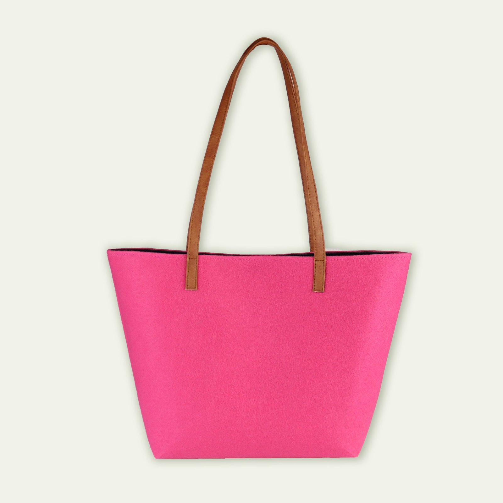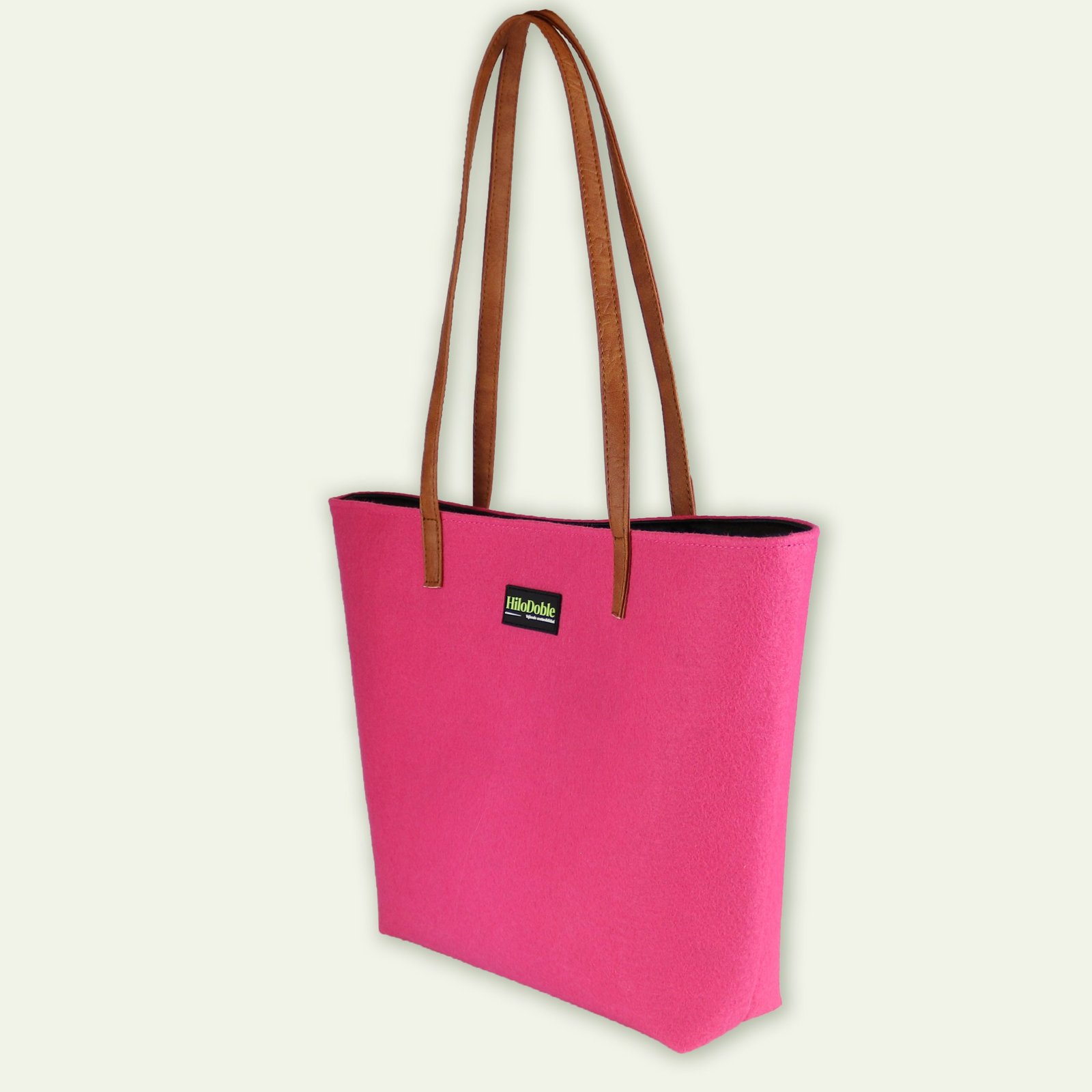 Bolso tipo shopper realizado con moqueta reciclada. Cierre centrado con clip imantado. Interior de material acolchado con bolsillo interno, doble asa marrón o negro imitación a cuero.