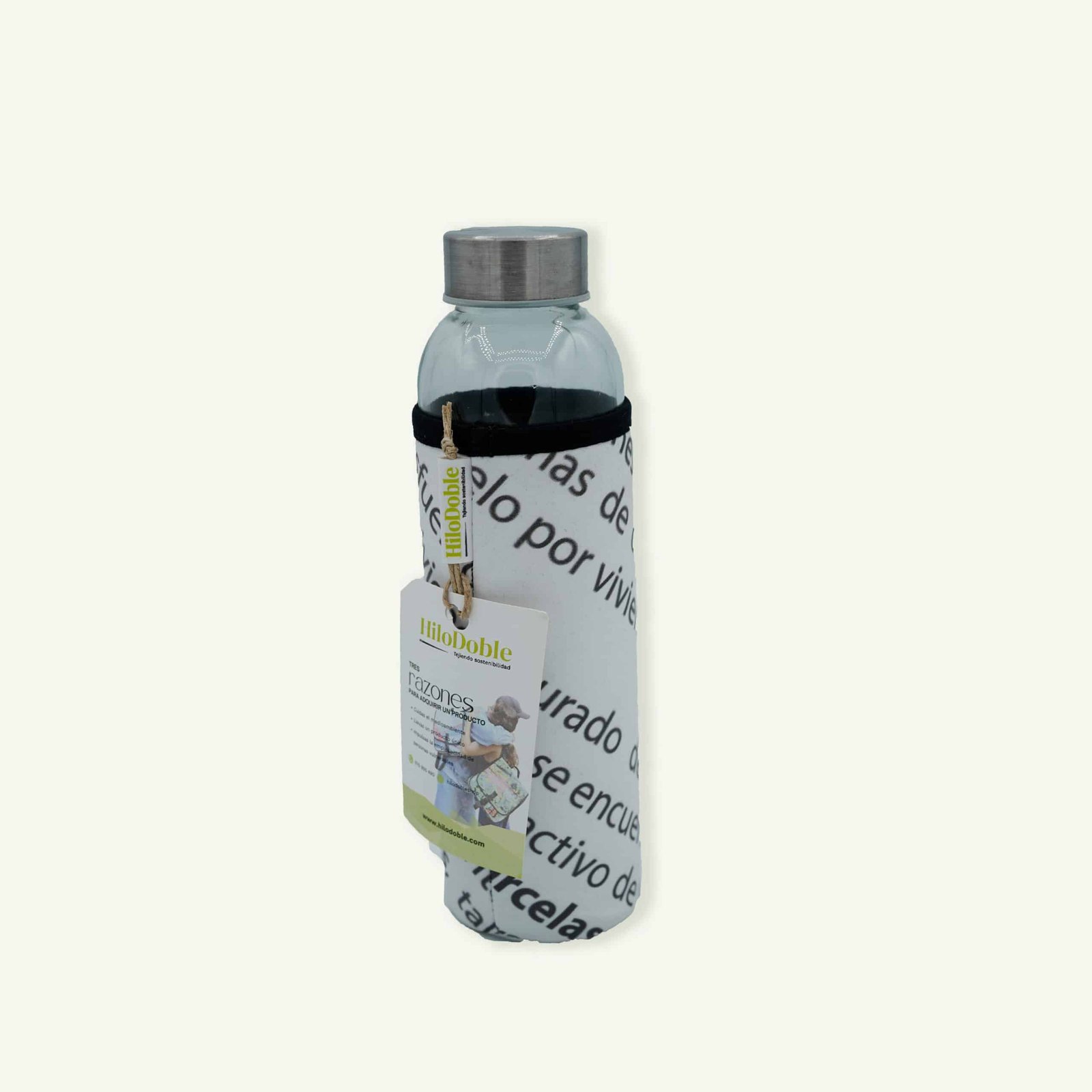 Fabricada en vidrio resistente y duradero, está acompañada de una funda de lona textil natural, lavable y reutilizable, que protege la botella y aporta un toque artesanal característico de HiloDoble.