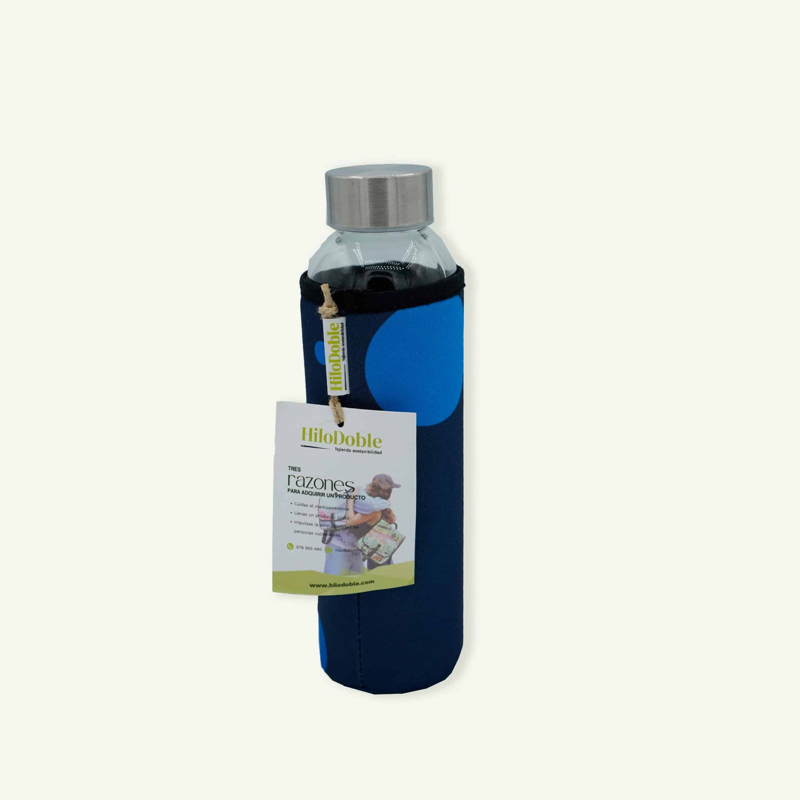 Fabricada en vidrio resistente y duradero, está acompañada de una funda de lona textil natural, lavable y reutilizable, que protege la botella y aporta un toque artesanal característico de HiloDoble.